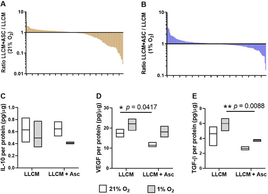 Protein levels of selected secreted cytokines were measured by ELISA (Figure 5C–E). Ascorbate supplementation significantly decreased secretion of TGF-β under hypoxia (Figure 5D, p = 0.009) and VEGF-A (Figure 5E, p = 0.042 for 21% O2, p = 0.055 for 1% O2), whereas no significant changes were seen for IL-10 (Figure 5C).
