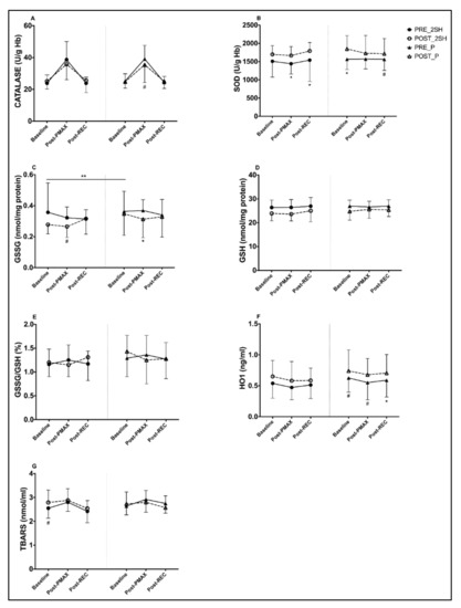 Differences between pre- and post-intervention intragroup in antioxidant and oxidant parameters at different points of the rectangular test (A–G). (C), a significant difference (p = 0.04) appears, comparing baseline of the second rectangular test between groups. * p < 0.05. # p = 0.05–0.06. ** p < 0.05 between post-intervention time points of rectangular test between groups (2S-hesperidin vs. placebo).