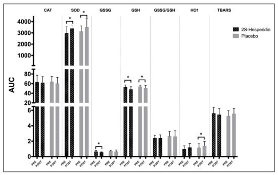 Intragroup differences between AUC (pre- and post-intervention) in antioxidant parameters. * p < 0.05. There were no significant differences between groups in AUC.