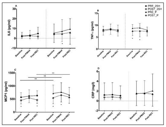 Differences between pre- and post-intervention intragroup and intergroup in inflammatory parameters at different points of the rectangular test (A–D). (C) a significant difference appears, comparing baseline (p = 0.043), Post-PMAX (p = 0.026) and Post-REC (p = 0.045) of the second rectangular test between groups. * p < 0.05. ** p < 0.05 between post-intervention time points of rectangular test between groups (2S-hesperidin vs. placebo).