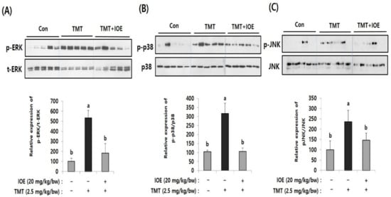 TMT-induced abnormal phosphorylation of mitogen-activated protein kinases (MAPKs) in the brains of each mouse group was restored by oral administration of IOE. Phosphorylation of extracellular signal-regulated kinase (ERK) (A), p-38 MAPK (B), and c-jun N-terminal kinase (JNK) (C) in mouse brains (n = 5) were measured by Western blotting. The density of each band was estimated by ImageJ program and the relative expression rates of ERK (p-ERK/t-ERK), p38 (p-p38/p38), and JNK (p-JNK/JNK) were calculated and tabulated. Data shown are means ± SD. Con: control (non-treated)). a: significant differences (p < 0.05) when compared with b.