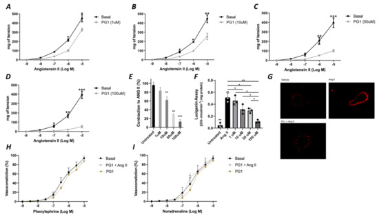 Considering that the main vascular effect of Ang II is mediated by the release of the high amount of ROS, we assessed the role of PG1 on the modulation of oxidative stress. Interestingly, measurement of oxidative stress by lucigenin assay revealed that PG1 pretreatment significantly reduced ROS production in a dose-dependent manner (Figure 2F). The statistical analysis revealed that at 100 mM of PG1, there was almost a complete abolition of ROS production. This result was also confirmed by DHE staining, which showed that at the highest concentration of PG1, mice mesenteric arteries were wholly protected from Ang II-induced ROS generation (Figure 2G). Of note, PG1 treatment does not affect phenylephrine or norepinephrine-evoked vasoconstriction (Figure 2H,I), thus confirming the peptide’s specificity to interact with the molecular mechanism involved in angiotensin signaling.