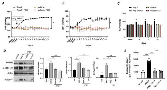 (A) Systolic blood pressure (SBP) and (B) diastolic blood pressure (DBP) and (C) mean arterial pressure (MAP) measured by tail-cuff method in wild-type mice daily treated with i.p injection of vehicle or PG1 (10 mg/Kg), or in wild-type angiotensin (Ang) II-infused mice daily treated with gavage administration of vehicle or PG1 (10 mg/Kg) mice. Values are means ± SEM. (D) Representative immunoblots conducted on extracts of mesenteric arteries excised at the end of in vivo (14th day) treatment from wild-type mice daily treated with gavage administration of vehicle or PG1 (10 mg/Kg), or in wild-type angiotensin (Ang) II-infused mice daily treated with gavage administration of vehicle or PG1 (10 mg/Kg) mice. (E) Oxidative stress measured by lucigenin assay in mice mesenteric arteries obtained at the end of in vivo treatment. *, p < 0.05; **, p < 0.001; ***, p < 0.0001.