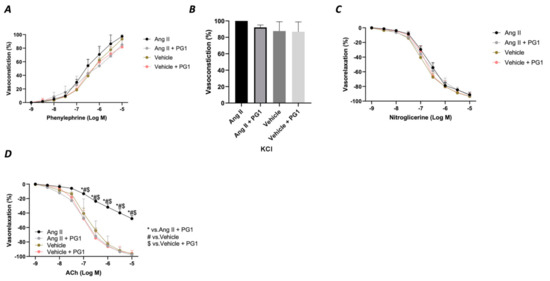 Considering the massive effect of PG1 on Ang II-evoked high blood pressure, we evaluated the vascular response of mesenteric arteries at the end of in vivo chronic treatment with the peptide. The analysis of the vasoconstrictive response to phenylephrine and potassium chloride revealed no modification on the contractile function of the vessels (Figure 4A,B). A similar effect was observed during the vasorelaxant response to nitroglycerine, which directly evokes a smooth muscle-dependent vasorelaxation (Figure 4C). In contrast, the analysis of endothelial vasorelaxation prompted by acetylcholine revealed a marked endothelial dysfunction in vessels obtained from Ang II-treated mice compared to vehicle-treated. Notably, PG1 administration protected against endothelial dysfunction evoked by chronic Ang II treatment (Figure 4D).