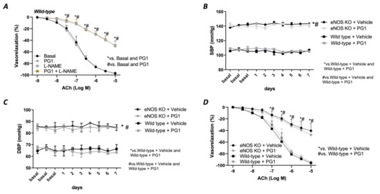 (A) Evaluation of ex vivo vascular reactivity of PG1 (100 μM for 1 h) in wild-type mice treated with eNOS inhibitor, L-NAME (300 μM for 30 min). (B,C) Tail-cuff measurement of systolic and diastolic blood pressure in wild-type and eNOS knock-out mice gavage-treated with vehicle or PG1 (10 mg/Kg) for 7 days. (D) Evaluation of endothelial-dependent relaxation in mesenteric arteries obtained from wild-type and eNOS knockout mice excised at the end of in vivo treatment (7th day) with vehicle or PG1.