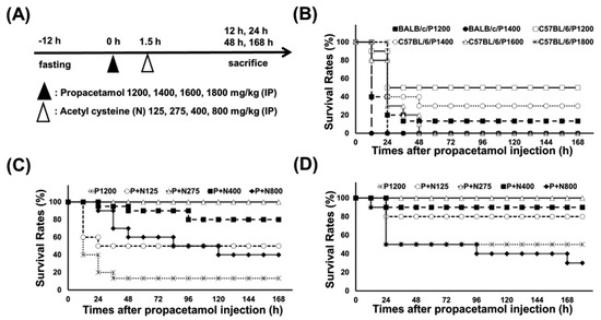 (A) Experimental designs and time charts for studying survivals following injections with different propacetamol (P) and N-acetyl cysteine (NAC) (N) doses and the dosage effects of N at indicated time points. (B) Survival rates of BALB/cByJNarl (BALB/c) and C57BL/6JNarl (C57BL/6) mice injected with indicated P doses at different time points. The survival rates of BALB/c (C) and C57BL/6 (D) mice injected with indicated N doses post-1200 mg/kg propacetamol (P1200) injection at different time points.