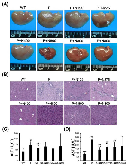 Some mice in the P+N400 and P+N800 groups, but not in the P1200 or P+N125 groups, died after 48 h, which was during the later recovery stage. Thus, we analyzed whether the cause of death in the P+N400 and P+N800 groups was related to liver regeneration between 48 h and 196 h. We compared the appearances and sizes of the livers of surviving mice from different P+N groups at 7 days. Livers in the P+N800 group were smaller than those in the other groups (Figure 2A). H&E staining of liver sections showed that liver tissues had not been completely repaired in any P+N group, except in the P+N800 group. All P+N groups showed better liver regeneration than the P group (Figure 2B). Although mice in the P+N800 group showed almost complete liver repair, some liver cells showed accumulations of lipids and limited gathering of inflammatory cells. Therefore, we suggest that mouse deaths in the P+N400 and P+N800 groups were caused by microvesicular steatosis in the liver and/or inflammation in the late recovery stage rather than by an inability to repair the liver. Serum ALT activities in the P group showed significant increases when compared with the WT group, but ALT activities in all the P+N groups were similar to those in the WT group (Figure 2C). Only the P+N125 group showed a significant decrease in ALT activities compared to the P group. Except for the P+N800 group, serum AST activities in the P and P+N groups showed significant increases when compared with the WT group. However, the P+N125 and P+N275 groups showed significant decreases compared to the P group (Figure 2D). Increases in serum AST activities suggested inflammation and/or damage in all P and P+N groups.