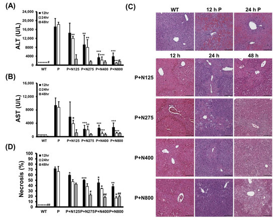 Serum ALT (A) and AST (B) activities, histopathological images (C), and percentages of necrosis (D) in liver sections at 12, 24, and 48 h post-P1200 injection and with or without indicated doses of NAC therapies in BALB/c mice. WT: Mice treated with the same volume of phosphate-buffered saline (PBS); P: P1200 injection only; P+N: After P1200 injection, mice were treated with 125 mg/kg (P+N125), 275 mg/kg (P+N275), 400 mg/kg (P+N400), or 800 mg/kg (P+N800) NAC. Significant differences compared with the P group are indicated by * (p < 0.05), ** (p < 0.01), and *** (p < 0.001). Significant differences compared with the P+N125 group are indicated by # (p < 0.05) and ## (p < 0.01). Scale bars: 100 μm.