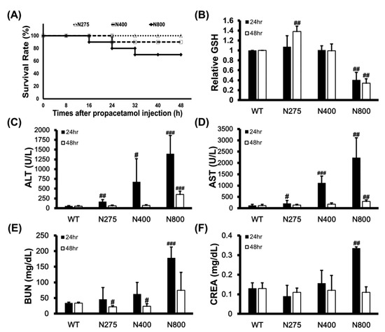Effects of different doses of NAC on survival rates of BALB/c mice within 48 h (A), relative reduced GSH levels in liver (B), serum ALT (C) and AST (D) activities, and blood urea nitrogen (BUN) (E) and creatinine (CREA) (F) levels at 24 h and 48 h post-NAC injection. The GSH levels in the WT group were defined as 100%. Significant differences compared with the WT group are indicated by # (p < 0.05), ## (p < 0.01), and ### (p < 0.001).
