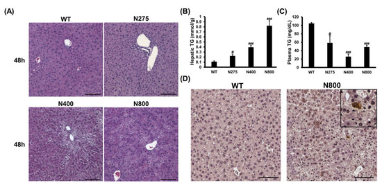 Since high-dose NAC (N800) decreases hepatic reduced GSH levels, increases hepatic IL-6, and damages mouse liver (Figure 6 and Figure 7), we attempted to decipher how NAC affects the liver in normal mice. In both the N400 and N800 groups, the liver appeared dehydrated at 48 h (Figure S3A). Lipid accumulations in hepatocytes, known as the fatty liver phenomenon, were observed in both the N400 and N800 groups at 48 h (Figure 8A). From our data, 1 of 5 mice in the N400 group and 4 of 5 mice in the N800 group showed fatty liver phenomenon. Hepatic triglyceride (TG) levels were significantly increased in all the N275, N400, and N800 groups at 48 h post-NAC injection compared to the WT group (Figure 8B). However, serum TG levels in all the N275, N400, and N800 groups showed a significant decrease at 48 h compared to the WT group (Figure 8C). Furthermore, serum total cholesterol (T-CHO) levels significantly increased in the N800 group at 48 h compared to the WT group (Figure S3B). These results supported the findings of fatty liver in the N800 (Figure 8A) and P+N800 groups (Figure 2B and Figure 3C).