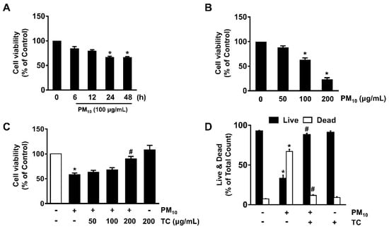 To confirm that fine particulate matter 10 (PM10), which has an aerodynamic diameter of less than 10 μm, induces cytotoxicity in human epidermal keratinocytes, HaCaT cells were treated with PM10 at various concentrations (0–200 μg/mL) for 24 h. PM10 significantly induced cytotoxicity in HaCaT cells at concentrations ranging from 100 to 200 μg/mL compared to untreated cells (Figure 1A). A decrease in cell viability was observed after incubation with 100 μg/mL of PM10 for 24 h (Figure 1B). To investigate the protective effect of tart cherry on the cytotoxicity of fine dust, cells were treated with 100 μg/mL of PM10 for 24 h prior to exposure to tart cherry at various concentrations (50–200 μg/mL) for 30 min. A pretreatment of 200 μg/mL of tart cherry significantly reversed the reduced cell viability caused by PM10 (Figure 1C). We also determined the functional role of tart cherry to block cell death induced by PM10 by means of a LIVE/DEAD viability/cytotoxicity assay for simultaneous determination of live and dead cells over a period of 24 h (Figure 1D). PM10 significantly induced a number of dead cells, whereas for the live cells, a significant cytotoxic effect was noted. However, tart cherry significantly prevents cytotoxicity induced by PM10. These results indicate that the protective effect of tart cherry against fine dust exposure is related to the blocking of the death of keratinocytes caused by PM10.