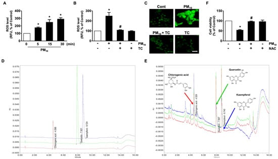 Antioxidative effect of tart cherry containing chlorogenic acid, quercetin, and kaempferol in HaCaT cells treated with PM10. (A) Time-dependent response of PM10 (100 μg/mL) on reactive oxygen species (ROS) production determined by staining HaCaT cells with 5-(and-6)-chloromethyl-2′,7′-dichlorodihydrofluorescein diacetate, acetyl ester (CM-H2DCFDA). Data are represented as the means ± S.E. n = 3. * p ≤ 0.01 vs. 0 min. (B) Cells treated with PM10 and tart cherry (TC, 200 μg/mL) for 15 min. Data are represented as the means ± S.E. n = 3. * p ≤ 0.01 vs. control. # p ≤ 0.001 vs. PM10 alone. RFU, Relative fluorescence units. (C) ROS production (green) visualized by confocal microscopy. Scale bars, 100 μm (original magnification × 100). n = 3. (D) Ultra performance liquid chromatography (UPLC) profile of the commercial standard compounds. (E) UPLC profile of three major compounds in tart cherry. The insets indicate the chemical structure of chlorogenic acid, quercetin, and kaempferol, respectively. (F) Cells were pretreated with the antioxidant N-acetylcysteine (NAC, 10 μM) for 30 min prior exposure to PM10 for 24 h. Cell viability was determined. Data are represented as the means ± S.E. n = 3. * p ≤ 0.001 vs. control. # p ≤ 0.01 vs. PM10 alone.