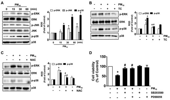 Tart cherry inhibits the activation of the extracellular signal-regulated kinase (ERK) and p38 mitogen-activated protein kinase (MAPK) pathways triggered by PM10. (A) Time-dependent response of PM10 (100 μg/mL) on the activation of mitogen-activated protein kinase (MAPK) in HaCaT cells determined by Western blot. (B) The effect of tart cherry (TC, 200 μg/mL) on the phosphorylation of ERK and p38 MAPK is shown. (C) Cells pre-treated with NAC prior to exposure to PM10 for 30 min. (D) Cells pretreated with SB203580 (10 μM) and PD98059 (10 μM) as inhibitors for p38 MAPK and ERK were incubated with PM10 for 24 h. Cell viability was determined. (A–D) Data are represented as the means ± S.E. n = 3. * p ≤ 0.01 vs. control. # p ≤ 0.05 vs. PM10 alone. ROD, relative optical density.