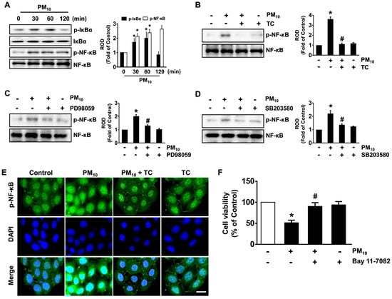 Tart cherry regulates the activation of nuclear factor-kappa B (NF-κB) responsible for the keratinocyte apoptosis caused by PM10. (A) Time-dependent response of PM10 (100 μg/mL) on the activation of nuclear factor of kappa light polypeptide gene enhancer in B-cells inhibitor alpha (IκBα) and NF-κB in HaCaT cells as determined by Western blot. (B) The effect of tart cherry (TC, 200 μg/mL) on the phosphorylation of NF-κB is shown. (C,D) Cells pretreated with PD980529 (10 μM) and SB203580 (10 μM) as inhibitors for ERK and p38 MAPK were incubated with PM10 for 30 min. (E) Representative immunofluorescence staining of NF-κB in cells co-treated with tart cherry and PM10 is shown. Scale bars, 100 μm (original magnification × 100). (F) Cells pretreated with Bay 11-7082 (10 μM) as an inhibitor for NF-κB were incubated with PM10 for 24 h. Cell viability was determined. (A–F) Data are represented as the means ± S.E. n = 3. * p ≤ 0.01 vs. control. # p ≤ 0.05 vs. PM10 alone. ROD, relative optical density.