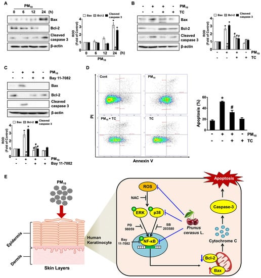 The pharmacological effect of tart cherry on keratinocyte apoptosis induced by PM10. (A) Time-dependent response of PM10 (100 μg/mL) on the expression of Bax, Bcl-2, and cleaved caspase-3 in HaCaT cells as determined by Western blot. (B) The effect of tart cherry (TC, 200 μg/mL) on the expression of apoptosis-related proteins is shown. (C) Cells pretreated with Bay 11-7082 (10 μM) as an inhibitor for NF-κB were incubated with PM10 for 24 h. (D) Cells were incubated with tart cherry and PM10 for 24 h. The proportion of apoptotic cells stained by Annexin V was analyzed using the NucleoCounter® advanced image cytometer. (E) The sequences of putative signaling pathways are summarized. (A–D) Data are represented as the means ± S.E. n = 3. * p ≤ 0.01 vs. control. # p ≤ 0.01 vs. PM10 alone. ROD, relative optical density.