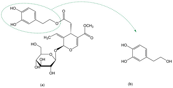 Biophenols derived from olives are used as traditional remedies for a variety of conditions, including inflammatory states and cardiovascular diseases. Oleuropein (OLE) and hydroxytyrosol (HT) are the most well-known compounds of this family. OLE is the main phenol in olive-derived olive products, being composed of an elenolic acid linked to an o-diphenol, hydroxytyrosol, and a glucose residue (Figure 1a). It is present in olive tree leaves and drupes. Its aglycone form is also found in olive oil (oleuropein is not soluble in oil due to the superior polarity) [1]. HT (Figure 1b), also known as 3,4-dihydroxyphenylethanol (DOPET) or 3,4-dihydroxyphenolethanol (3,4-DHPEA) or 4-(2-hydroxyethyl)-1,2-benzenediol, results from OLE degradation. It is found mainly in olive oil and cured olives and, in lower amounts, in olive leaves and other products such as grapes, wine and olive by-products [2,3,4]. Its occurrence in wine has been proposed to result from alcoholic fermentation or from the enzymatic oxidation of tyrosol (TYR) [2,5]. OLE is responsible for the bitter taste of fresh olives. To become acceptable by consumers, fresh olives are submitted to a de-bittering process in which OLE is hydrolysed to HT and elenolic acid, two non-bitter compounds [6]. Degradation of OLE occurs both during the maturation of the olives and oil storage [7].