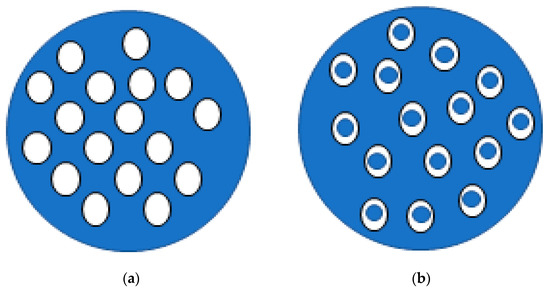 Schematic representation of simple (a) and double (b) emulsions: white fill correspond to the oil phase and blue fill represents water phase.