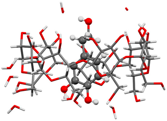 Structure of the inclusion complex β-CD·HT·6H2O, reported by Aree and Jongrungruangchok from single-crystal X-ray diffraction studies [74]. A single unit of the complex is represented, along with the six hydration waters one of them with disorder; the molecule of HT is represented with the ball-and-stick model for highlight, showing the catechol hydroxy groups facing downwards to the smaller rim of the host. Waters and the β-CD molecule are represented by sticks. Image was redrawn with the software Mercury 3.5.1 (Copyright CCDC 2001–2014) from the atomic coordinates of β-CD·HT·6H2O, available from the CCDC with the refcode CIQFOA.