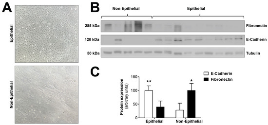 Epithelial-to-mesenchymal transition of mesothelial cells during PD. (A) Phase-contrast microscopy showing different morphologic characteristics of mesothelial cells with epithelial and non-epithelial phenotypes. Original magnification ×10. (B) Western blot showing the expression of typical markers of epithelial-to-mesenchymal transition, E-cadherin (epithelial marker) and fibronectin (mesenchymal marker). (C) The graph shows the mean ± SEM levels of expression in nine epithelial samples and five non-epithelial samples; ** p < 0.01 and * p < 0.05 vs. non-epithelial and epithelial cells, respectively. PD: peritoneal dialysis.