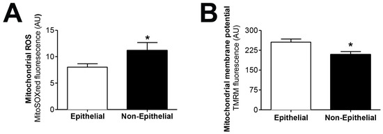 Effluent-derived human mesothelial cells with non-epithelial phenotype exhibit increased mtROS and decreased mitochondrial membrane potential. (A) Epithelial and non-epithelial mesothelial cells were stained with MitoSOX Red and analyzed by flow cytometry. Values are the mean ± SEM median fluorescence intensity (n = 62 epithelial samples and n = 17 non-epithelial samples). * p < 0.05 vs. epithelial cells. (B) Epithelial and non-epithelial mesothelial cells were loaded with tetramethylrhodamine methyl ester and analyzed by flow cytometry. Values are the mean ± SEM median fluorescence intensity (n = 62 epithelial samples and n = 15 non-epithelial samples). * p < 0.05 vs. epithelial cells. PD: peritoneal dialysis.