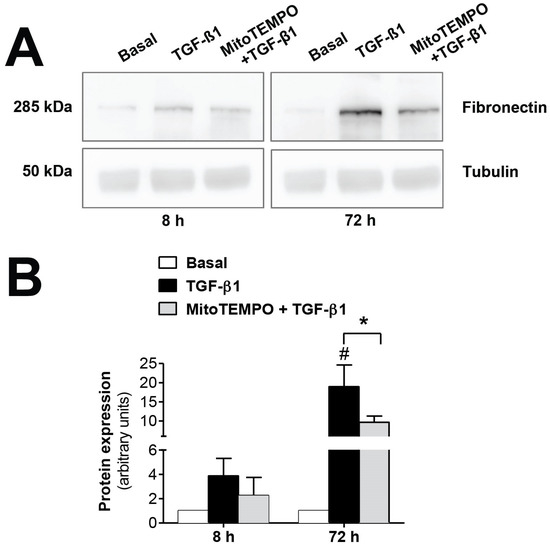 Modulatory effects of MitoTEMPO on TGF-β1-induced epithelial-to-mesenchymal transition (EMT) in omentum-derived mesothelial cells. (A) Representative Western blot analysis of fibronectin expression at 8 and 72 h in TGF-β1-treated mesothelial cells with and without Mito TEMPO pretreatment and (B) quantification expressed in arbitrary units. Bars represent the fold induction over untreated cells as means ± SEM of three independent experiments. * p < 0.05 vs. TGF-β1 and # p < 0.05 vs. Basal. PD: peritoneal dialysis; EMT: epithelial-to-mesenchymal transition.