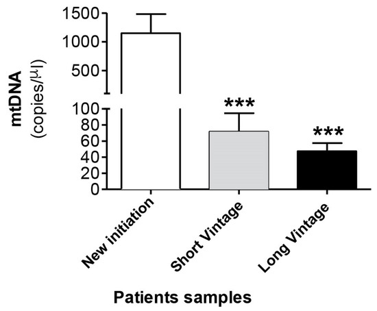mtDNA levels in the peritoneal effluent from PD patients. Values are the mean ± SEM mtDNA copy numbers of patients classified according to time in PD in new initiation (n = 49), short vintage (n = 70) and long vintage (n = 113) samples. *** p < 0.001 vs. first connection. PD: peritoneal dialysis.