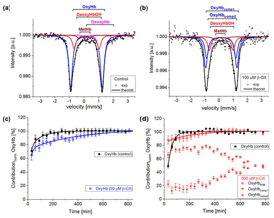 Exemplary steady-state Mössbauer spectra of RBCs: (a) untreated (control), and (b) incubated with 100 μmol/L β-Crt (RBCs100) measured at 85 K. The experimental data (exp) is indicated by points and theoretical curves (-theoret) by lines. The characteristic doublets for the different forms of haemoglobin are shown as sub-spectra. Time evolution of the normalised oxyhaemoglobin contribution in RBCs incubated in the presence of 50 μmol/L β-Crt (blue open circle) (c) and 500 μmol/L β-Crt (red open circle) (d), in comparison with respective controls (filled square). Additionally, in (d), two resolved subcomponents of oxyhaemoglobin in RBCs500 are shown (OxyHbcomp1, half-up filled circle; OxyHbcomp2, half-down filled circle). The oxygen saturation level of Hb in the treated and corresponding untreated RBCs was the same within the measurement uncertainty: for RBCs50 ~73 ± 1% and RBCs500 72 ± 2%. Error bars shown in Figures (c,d) correspond to the accuracy of the theoretical fit of Mössbauer spectra.