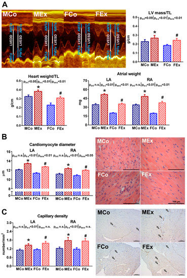 (A) Representative M-mode recordings of the left ventricle (LV) from one–one male control (MCo), male exercised (MEx), female control (FCo), and female exercised (FEx) animals. The lines show anterior wall thickness (AWT) at diastole (index: d) and systole (index:s), LVEDD (LV end-diastolic diameter), LVESD (LV end-systolic diameter), and posterior wall thickness (PWT) at diastole (index: d) and systole (index:s). Calculated LV mass and post-mortem measured heart weight values normalized to tibial length (TL) are shown. Atrial weight data from both left (LA) and right atrium (RA) confirmed atrial hypertrophy. (B) The upper part shows cardiomyocyte diameter data and representative left atrial hematoxylin-eosin stained sections from one animal of each group (magnification 400×, marker 100 µm). (C) The part below shows capillary density data in both atrium and representative CD31 immunostained sections from the left atrium (magnification 200×, marker 100 µm, arrows indicate positively stained capillaries). Values are means ± SEM. * p < 0.05 vs. MCo, # p < 0.05 vs. FCo. pex and psex: p-value of two-way analysis of variance (ANOVA) factors exercise and sex, respectively; pint: interaction p-value of ANOVA.