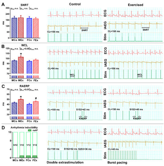 (A) Sinus node recovery time (SNRT) data in male control (MCo), male exercised (MEx), female control (FCo), and female exercised (FEx) animals and representative electrocardiogram (ECG, lead II), intraatrial electrogram (IAEG), and stimulation marks (Stim) during the SNRT maneuver in one control and exercised animal. (B) Wenckebach cycle length (WCL) data and representative ECG, IAEG, and Stim curves of one control and exercised animal. The longest cycle length (CL) inducing Mobitz type-1 AV-block constituted the WCL. (C) Right atrial refractory period (RAERP) data and representative ECG, IAEG, and Stim curves from an exercised and a control animal. (D) Atrial arrhythmia inducibility by using double extra stimulation (DES) or burst pacing protocol and representative ECG, IAEG, and Stim curves from an exercised and a control animal. CL: cycle length. Values are means ± SEM. * p < 0.05 vs. MCo, # p < 0.05 vs. FCo. pex and psex: p-value of two-way analysis of variance (ANOVA) factors exercise and sex, respectively; pint: interaction p-value of two-way ANOVA.