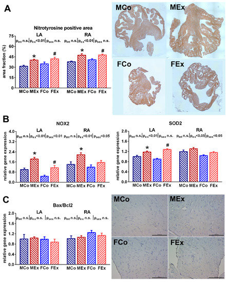 (A) Nitrotyrosine positive area fraction data from left (LA) and right atrium (RA) with representative whole left atrial sections from one–one male control (MCo), male exercised (MEx), female control (FCo), and female exercised (FEx) animals. (B) Atrial gene expression data of NADPH oxidase 2 (NOX2) and superoxide dismutase 2 (SOD2). (C) The atrial gene expression ratio of proapoptotic Bcl-2-associated X protein (Bax) and anti-apoptotic Bcl-2. Representative terminal deoxynucleotidyl transferase-mediated dUTP nick-end labeling (TUNEL) stained left atrial sections (magnification 200x, marker 100 µm). Note that no positively stained nuclei were visualized. Values are means ± SEM. * p < 0.05 vs. MCo, # p < 0.05 vs. FCo. pex and psex: p-value of two-way analysis of variance (ANOVA) factors exercise and sex, respectively; pint: interaction p-value of ANOVA.