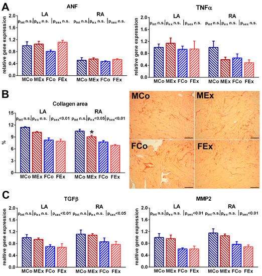 (A) Atrial natriuretic factor (ANF) and tumor necrosis factor α (TNFα) gene expression data from left (LA) and right atrium (RA) in male control (MCo), male exercised (MEx), female control (FCo), and female exercised (FEx) animals. (B) Atrial collagen area data and representative picrosirius stained LA sections (magnification 200×, marker 100 µm, red stained indicates collagen). (C) The atrial gene expression ratio of transforming growth factor β (TGFβ) and matrix metalloproteinase-2 (MMP2). Values are means ± SEM. * p < 0.05 vs. MCo. pex and psex: p-value of two-way analysis of variance (ANOVA) factors exercise and sex, respectively; pint: interaction p-value of two-way ANOVA.