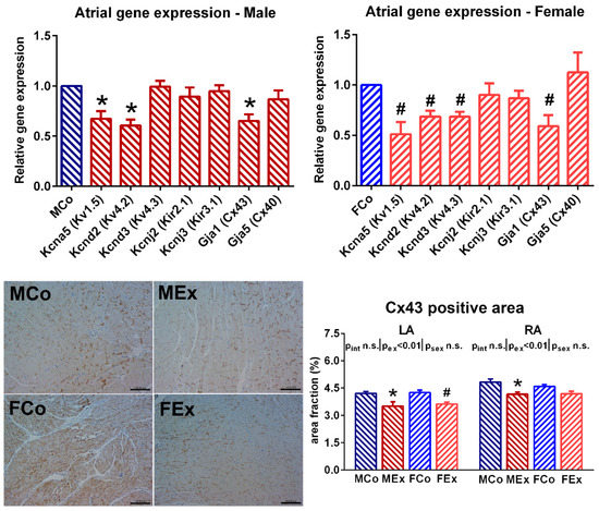 Upper panel Right atrial gene expression of different voltage-gated potassium channels (Kv1.5, Kv4.2, and Kv4.3), inward rectifier potassium channels (Kir2.1 and Kir3.1), and connexins (Cx40 and Cx43) in male and female animals. Relative gene expression values of exercised rats were compared to male control (MCo) and female control (FCo) animals. Lower panel Representative left atrial Cx43 immunostained sections (magnification 200×, marker 100 µm) from one–one MCo, male exercised (MEx), FCo, and female exercised (FEx) animals a Cx43 density data from the left (LA) and right (RA) atrium. Values are means ± SEM. * p < 0.05 vs. MCo, # p < 0.05 vs. FCo. pex and psex: p-value of two-way analysis of variance (ANOVA) factors exercise and sex, respectively; pint: interaction p-value of two-way ANOVA.