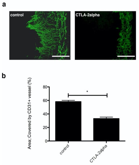 Corneal angiogenesis by suture placement in CTLA-2 alpha (Cytotoxic T-Lymphocyte-Associated protein 2) treatment. (a) Fluorescence microscopy image of CD31-positive staining (green), which represents corneal hemangiogenesis, 7 d after suture placement. (b) Corneal hemangiogenesis, measured by the area of CD31-positive staining, 7 days after suture placement. Scale bars, 75 µm. Note: * p = 0.0357.