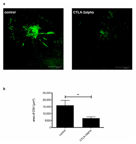 Laser-induced CNV (Choroid Neo Vasculalization) and the effects of CTLA-2 alpha treatment. (a) Confocal microscope image of tomato lectin staining, representing laser-induced CNV. (b) Laser-induced CNV, as measured by the area of tomato lectin staining 7 d after suture placement. Scale bars, 150 µm. ** p = 0.0100.