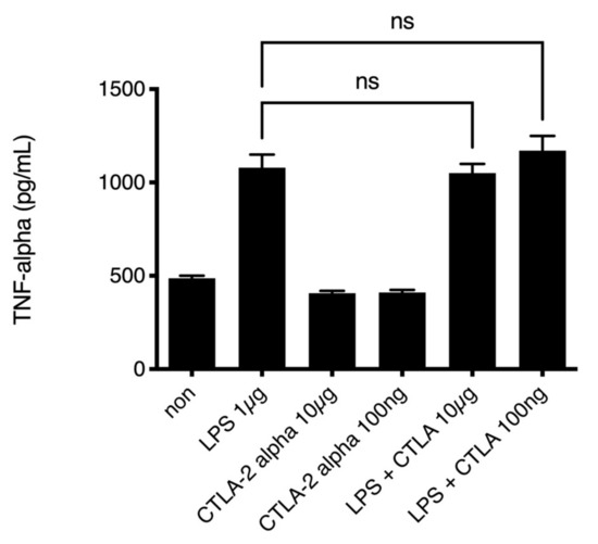 TNF-alpha secretion from peritoneal infiltrating cells. Peritoneal exudate CD11b and F4/80 double-positive cells were cultured with PBS (non as control), LPS (1 µg/mL), CTLA-2 alpha (10 µg/mL or 100 ng/mL), or both LPS and CTLA-2 alpha. TNF accumulation in the culture media was measured 24 h after stimulation using an ELISA kit. LPS: lipopolysaccharide; ns.: not significant difference.