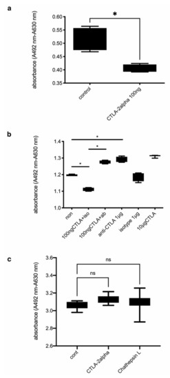 Quantification of mVEC proliferation after treatment with CTLA-2 alpha or anti CTLA-2 alpha neutralizing antibody. (a) Proliferation of mVECs following treatment with PBS or CTLA-2 alpha, analyzed using an XTT cell proliferation assay kit. Cell proliferation is indicated by the absorbance (* p = 0.0286; n = 4). (b) Effects of CTLA-2 alpha and an antiCTLA-2 alpha antibody on mVEC proliferation; iso, 1 µg of iso-type control; ab, 1 µg of CTLA-2 alpha neutralizing antibody (* p = 0.0286; n = 4). (c) Effects of CTLA-2 alpha overexpression on mVEC proliferation in vitro (n = 5). CTLA-2 alpha, CTLA-2 alpha overexpression in mVECs; Cath L, Cath L overexpression in mVECs; n.s., not significant.
