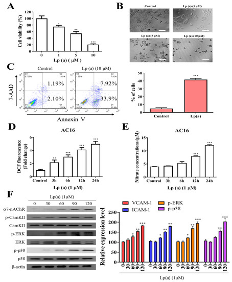 To examine the effect of Lp(a) on cell viability of human ventricular cardiomyocyte, AC16 were treated with increasing concentration of Lp(a) up to 10 µM. Cell viability of A16 cells (Figure 1A) was measured after 48 h of treatment using a Cell Counting Kit-8 and the morphology of the cells was captured under the microscope (Figure 1B). Lp(a) treatment at 1 µM to 5 µM decreases cell viability to 65%, while treatment with 10 µM of Lp(a) decreased the cell viability to approximately 30% compared to the control group cells (Figure 1A). Apoptosis is a major cause of cell growth inhibition to evaluate the effect of Lp(a) on cell growth. Lp(a) treated and non-treated AC16 cell were stained with annexin V/7-AAD. Flow cytometry analysis of stained cells showed predominant apoptosis of Lp(a) treated cells (Figure 1C). In addition, we quantified the intracellular redox status, and measured DCF fluorescence. These experiments revealed a two-fold increase of fluorescence 24 h post Lp(a) addition in A16 cells. The DCF response was more pronounced in time-dependently increased (3.3-fold). In these cells, Lp(a) increased DCF fluorescence by 5.7-fold (Figure 1D). Nitrate concentrations (surrogate markers for NO production via iNOS) in Lp(a)-treated A16 cells increased by 3-fold (Figure 1E). To estimate the effect α7-nAChR on cardiomyocytes, the protein expression analysis was performed. The result from immunoblotting analysis described in Figure 1F, Lp(a) treatment (10 µM) shows a positive effect on the expression of α7-nAChR and the phosphorylation status of CamKII, p38-MAPK or ERK.