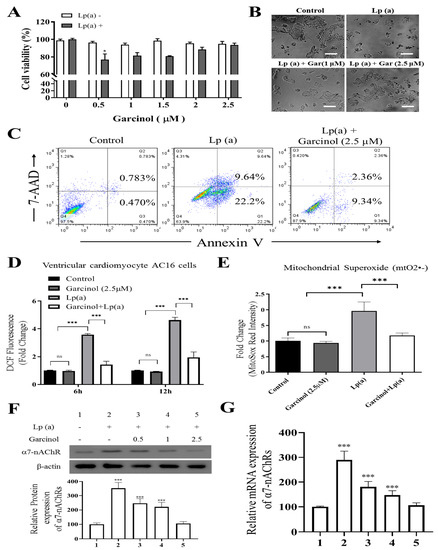 To elucidate whether garcinol treatment inhibited cell cytotoxicity caused by Lp(a), we performed cell viability assay by Cell Counting Kit-8 and annexin V/7-AAD apoptosis assay of AC16 cells, sensitized by 1 µM Lp(a), then treated with different concentration of garcinol (0.5–2.5 µM). Different concentrations of garcinol did not affect the viability of cardiomyocytes. Moreover, garcinol inhibited the cell cytotoxicity induced by Lp(a) in concentration-dependent manners, with 0.5 µM being the lowest effective concentration (Figure 2A) and less vulnerable to Lp(a)-related cytotoxic effects, as shown in Figure 2B. Protective effects of garcinol against the cell apoptosis of AC16 cells were analyzed by flow cytometry analysis (Figure 2C), demonstrating that the 24 h incubation of AC16 cells with garcinol (1 μM) significantly reduced the apoptosis induced by Lp(a). Therefore, ROS level was quantified using flow cytometer 6 and 12 h after Lp(a) stimulation (10 μM) with or without garcinol pretreatment (2.5 μM) for 6 h. Similarly, Lp(a)-induced ROS production and mitochondrial superoxide mtO2•− production was markedly decreased by garcinol post-Lp(a) exposure (Figure 2D,E). To further confirm that garcinol was able to prevent α7-nAChR effects on AC16 cells, Western blot and qRT-PCR analysis were used to evaluate the expression of α7-nAChR. Garcinol (0.5–2.5 μM) suppressed α7-nAChR expression both at protein and mRNA level dose-dependently (Figure 2F,G). Collectively, an exposure-response relationship exists between garcinol and the reduction in oxidative stress, in which both the amount and the duration of garcinol used modulate this association.