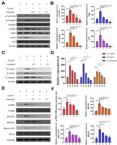We determined α7-nAChR mediated phosphorylation and regulation in the expression of adhesion molecules on cardiomyocytes. The protein analysis was performed after garcinol (2.5 µM) treatment. As shown in Figure 3A,B, garcinol inhibited the α7-nAChR along with the inhibition of phosphorylation of key signaling molecules, such as CamKII, ERK and p38 MAPK, reversing the effect caused by Lp(a) treatment. As shown in Figure 3C, Western blot analysis showed that adhesion molecules expression, especially vascular cell adhesion molecule 1 (VCAM-1), ICAM-1, and E-selectin were upregulated by Lp(a) and suppressed by garcinol. The effect of garcinol on reversing Lp(a)-induced increased expression of VCAM-1, ICAM-1, and E-selectin were further demonstrated by mRNA expression analysis showed in Figure 3D, that garcinol treatment significantly reduced the VCAM-1, ICAM-1 and E-selectin expression. To further understand the influence of Lp(a) on the Rho GTPase, we examined the activation of an important Rho GTPases, RhoA-GTP, and its downstream effector, ROCK. Western blot and ROCK activity analysis shows garcinol deactivates the Lp(a)-mediated activated the expression of p-myosin-binding subunit (p-MBS), ROCK1, ROCK2, RhoA-GTP. (Figure 3E,F).