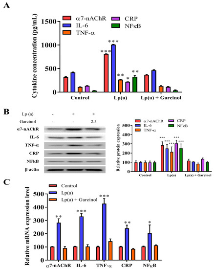 Garcinol inhibited Lp(a)-induced activation of α7-nAChR/p38 MAPK/NFkB in cardiomyocyte AC16 cells. (A) Enzyme-linked immunosorbent assay (ELISA) result showed that garcinol significantly decreased the Lp(a)-induced expression of α7-nAChR and proinflammatory cytokines (interleukin-6 (IL-6), tumor necrosis factor (TNF)-α, C-reactive protein (CRP), and NFkB). (B) Protein and (C) mRNA expression of α7-nAChR, IL-6, TNF-α, CRP, and NFkB were significantly reduced by garcinol. * p < 0.05, ** p < 0.01, *** p < 0.001.