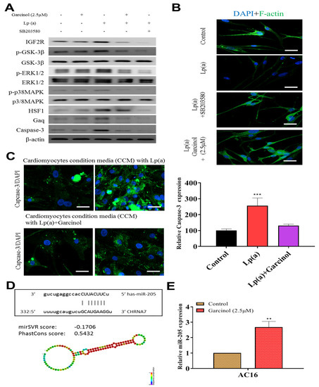 Garcinol inhibited Lp(a)-induced expression of insulin-like growth factor 2 receptor (IGF2R), caspase-3 and p-GSK-3β/NF-κB, and p-ERK/p-p38 MAPK (Figure 5A). SB203580 had a similar inhibitory effect of garcinol. Immunofluorescence analysis of F-actin polymerization using rhodamine-phalloidin dye (F-actin, red-orange), in which nuclei were stained DAPI (blue), showed that the expression of F-actin was increased on garcinol treatment in comparison to Lp(a) and SB203580 treatment (Figure 5B). AC16 cardiomyocytes were treated with condition media with Lp(a) alone and with garcinol (2.5 μM). A substantial reduction in caspase-3 activation, suggesting less apoptosis, was observed in garcinol treatment in comparison to Lp(a) only treatment (Figure 5C). The mir-Target prediction showed the three prime untranslated region (3′UTR) sites of Cholinergic Receptor Nicotinic Alpha 7 Subunit (CHRNA7) was targeted by miR-205 (Figure 5D). Garcinol treatment compared to control significantly upregulated miR-205 expression (Figure 5E).