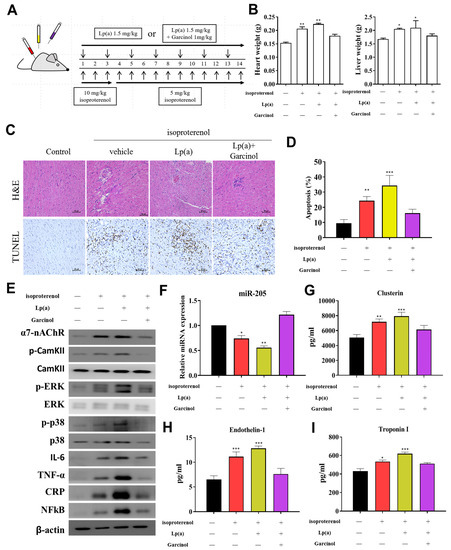 Garcinol suppressed Lp(a)-induced myocardial apoptosis and inflammation in a mouse model of myocardial infarction. (A) The protocol for the induction of myocardial infarction in C57/B6 mice. (B) The heart and liver weight of the control group, and Lp(a) treated mice as compared to the garcinol treatment in mice. (C) H&E and transferase dUTP nick end labeling (TUNEL) staining results of myocardium in the sham, Lp(a) and garcinol groups. (D) Quantitative analysis of percentage apoptosis. (E) Western blot showed a decrease in the expression of pro-inflammatory cytokines TNF-α, IL-6, CRP, NFκB, and phosphorylated CamKII/ERK/p38 MAPK by garcinol. β-actin was used as the loading control. (F) RT-qPCR analysis indicated that the relative miR-205 expression was significantly higher in mice treated with garcinol in comparison to Lp(a) group. (G–I) Enzyme-linked immunosorbent assay (ELISA) analysis results as compared to the treatment group, the significant reduction in the level of hemodynamic and cardiac function markers clusterin, endothelin-1 and troponin I. * p < 0.05, ** p < 0.01, *** p < 0.001.