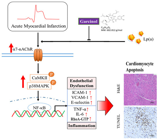 Garcinol significantly decreased the Lp(a)/α7-nAChR-mediated protein expression levels of inflammatory cytokines and phosphorylation activation of CamKII/p38 MAPK signaling, resulting in reduced post-infarct cardiomyocyte apoptosis.
