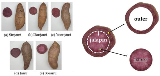 Images of the five purple sweet potato cultivars harvested in Korea and a diagram indicating the jalapin, outer, and inner layers of Borami, defined in this study.