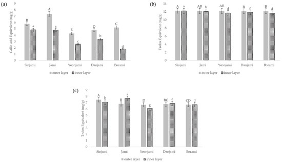 (a) Total phenolic content, (b) antioxidant activity measured by 2,2-diphenyl-1-picrylhydrazyl (DPPH) assay, and (c) antioxidant activity measured by performing 2,2′-azino-bis (3-ethylbenzothiazoline 6-sulphonic acid) (ABTS) assay of outer and inner layers of five purple sweet potato cultivars. Values designated with different uppercase and lowercase letters (A–D, a–d) differed significantly for the outer and inner layers, respectively (p < 0.05).