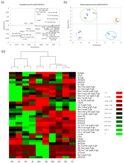 Figure 3a–c show the visualized results of PCA and heatmap based on anthocyanin composition and antioxidant activity in the five purple sweet potato cultivars. In Figure 3a,b, the first two principal components (PC1 and PC2) explained 56.58% of the total variables, with values of 32.86% and 23.72% for PC1 and PC2, respectively. The five cultivars were well-separated into four clusters (cluster 1, ‘Sinjami’ (SO, SI); cluster 2, ‘Jami’ (JO, JI); cluster 3, ‘Borami’ (BO, BI); and cluster 4, ‘Yeonjami’ (YO, YI) and ‘Danjami’ (DO, DI). The outer (O) and inner (I) layers of each cultivar were classified under the same cluster. Most of the di-acylated anthocyanins, chlorogenic acid, trans-ferulic acid, and quercetin hexosides were correlated with ‘Jami’, whereas ‘Sinjami’ correlated with mono-acylated anthocyanins. Cluster 3 samples were highly correlated with pelargonidin-based anthocyanins, caffeic acid, and p-coumaric acid.