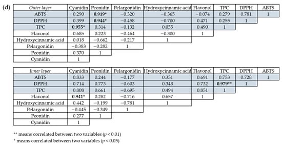 Figure 3d displays Pearson’s correlation among anthocyanin contents, non-anthocyanin phenolic compound contents, TPC, and antioxidant activities (DPPH and ABTS). For simplification of the data presentation, the identified 20 individual anthocyanin compounds were grouped into three categories based on their aglycone (i.e., cyanidin, peonidin, and pelargonidin), and non-anthocyanin phenolic compounds were grouped into two categories (i.e., hydroxycinnamic acid and flavonol). Pearson’s correlations among individual phenolic compounds, total phenolic content (TPC), and antioxidant activities (ABTS and DPPH) of the outer and inner layers are shown in Table S2a–d. In the outer layer, peonidin content was positively correlated with antioxidant activities (DPPH and ABTS) (p < 0.05), and cyanidin contents positively correlated with only TPC (p < 0.05). Previous studies also showed a positive correlation between anthocyanin contents and antioxidant activities [38,39]. In the inner layer, cyanidin contents showed a significantly high correlation with flavonol contents (p < 0.05), with TPC positively correlated with DPPH activity (p < 0.05).