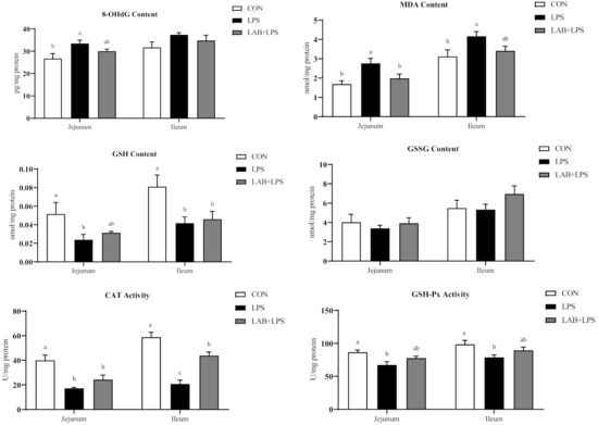 Compared with the CON group, challenge with LPS increased 8-OHdG and MDA contents; decreased CAT and GSH-Px activity, and GSH contents in jejunum (p < 0.05) (Figure 2). Relative to the LPS group, piglets in the LAB + LPS group had lower MDA contents but higher SOD activity in jejunum (p < 0.05).
