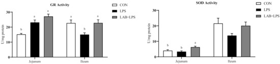 As shown in Figure 2, LPS challenge markedly increased ileal MDA contents (p < 0.05). LPS-challenged piglets also showed lower GSH contents, and CAT, GSH-Px and GR activity in ileum (p < 0.05). Piglets receiving LAB administration had higher CAT and GR activity in ileum compared with the LPS group (p < 0.05).