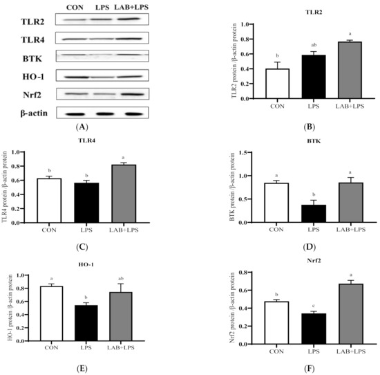 The effects of LAB supplementation on the protein expression of TLRs, Btk, and Nrf2 in the ilea of weaned piglets. Expression based on Western blotting (A) and quantification for (B) TLR2, (C) TLR4, (D) Btk, (E) HO-1, and (F) Nrf2. Data are presented as means ± SEM (n = 6). a,b,c Mean values within a row with different superscript letters indicate significant differences (p < 0.05). CON—non-challenged piglets fed a basal diet; LPS—LPS-challenged piglets fed a basal diet; LAB + LPS—LPS-challenged piglets fed a basal diet supplemented with 0.2% LAB. TLR2—Toll-like receptor 2; TLR4—Toll-like receptor 4; BTK—Bruton’s tyrosine kinase; HO-1—hemeoxygenase-1; Nrf2—nuclear factor erythroid 2-related factor 2.